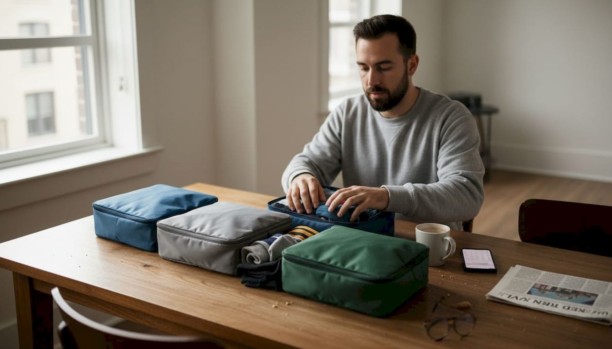 Packing cubes compress and organize efficiently. Use one cube for tops, another for bottoms, and a smaller cube for undergarments. Compression cubes squeeze air out, creating 30% more space than loose packing. The organizational benefit matters more than compression, as you can locate any item in seconds.
